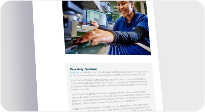 Case study: Brandauer Brandauer is one of the largest contract presswork and stampings companies in Europe. It delivers to 22 countries worldwide and has won the Queen’s Award for Enterprise in International Trade. Stuart Gregory, Finance Director at Brandauer, says: “We outlined our five-year growth plan in 2017, which focused on building our market share in four specialist ‘own product’ areas: turn-key progression tooling, electrical laminations, solderless printed circuit board connectors and self- adhesive cable clips. “Just 18 months on, and we are well ahead of schedule with all four lines on stream and sales breaking £9 million, a 10% increase on the same period in 2018. While Brexit uncertainty is causing some of our global clients to hold back on forward repeat orders, we are still picking up new R&D and tooling orders in the EU, at home in the UK and across the rest of the world.” Gregory adds: “Everything we do is manufactured at our state-of-the-art facility in Birmingham, a city we have been based in for over 157 years. Eighty-five per cent of our current annual sales is exported to international markets, half of which is direct from our factory. This has gone up 4% year- on-year since 2015, recently conquering ‘hard to break’ territories of Israel, the USA, Saudi Arabia and Germany; the home to our most intense competition.” Stuart Gregory Finance Director at Brandauer The small business guide to import and export 9