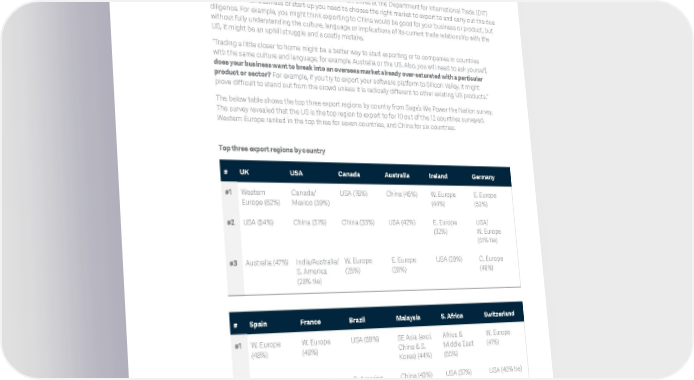 Choosing an export market The next step when you have decided to export your goods or services is to decide who to trade with. Rollo Hope, Head of Exports, Technology and Smart Cities at the Department for International Trade (DIT) says: “As a small business or start-up you need to choose the right market to export to and carry out the due diligence. For example, you might think exporting to China would be good for your business or product, but without fully understanding the culture, language or implications of its current trade relationship with the US, it might be an uphill struggle and a costly mistake. “Trading a little closer to home might be a better way to start exporting or to companies in countries with the same culture and language, for example Australia or the US. Also, you will need to ask yourself, does your business want to break into an overseas market already over-saturated with a particular product or sector? For example, if you try to export your software platform to Silicon Valley, it might prove difficult to stand out from the crowd unless it is radically different to other existing US products.” The below table shows the top three export regions by country from Sage’s We Power the Nation survey. The survey revealed that the US is the top region to export to for 10 out of the 12 countries surveyed. Western Europe ranked in the top three for seven countries, and China for six countries. Top three export regions by country # UK USA Canada Australia Ireland Germany #1 Western Canada/ USA (76%) China (45%) W. Europe E. Europe Europe (62%) Mexico (39%) (44%) (53%) #2 USA (54%) China (31%) China (33%) USA (42%) E. Europe USA/ (32%) W. Europe (51% tie) #3 Australia (47%) India/Australia/ W. Europe E. Europe USA (29%) C. Europe S. America (25%) (28%) (46%) (28% tie) # Spain France Brazil Malaysia S. Africa Switzerland #1 W. Europe W. Europe USA (59%) SE Asia (excl. Africa & W. Europe (48%) (48%) China & S. Middle East (41%) Korea) (44%) (55%) #2 USA (44%) USA (38%) S. America China (43%) USA (37%) USA (40% tie) (36%) #3 C. Europe E. Europe China (35%) Australia (33%) China (31%) C. Europe (37%) (29%) (38%) The small business guide to import and export 10