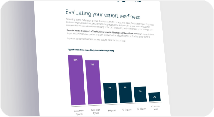What to consider when exporting goods Evaluating your export readiness According to the Federation of Small Businesses (FSB) in its July 2016 report, Destination Export: The Small Business Export Landscape, small firms that export are more likely to survive, grow and innovate when compared to those that don’t, contributing to the UK’s productivity and position as a global trading power. Exports form a major part of the UK Government’s drive to boost the national economy. It has aspirations to get 100,000 more companies to export and double the value of exports to £1 trillion a year by 2020. So, when as a small business are you ready to make the ‘export leap’? Age of small firms most likely to consider exporting 21% 19% 9% 9% 7% 4% Less than Less than 5-9 years 10-19 years 20-49 years 50 or more 2 years 4 years years Start-ups The FSB study suggests 21% of startups make the decision within two years and 19% of startups make the decision to export within four years. The small business guide to import and export 8