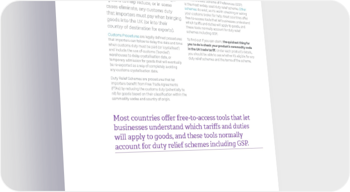 Customs Procedures and Duty Relief Schemes There are a number of perfectly legal The Generalised Scheme of Preferences (GSP) options to help reduce, or in some is the most widely used duty relief scheme. Other schemes do exist, so it’s worth checking or asking cases eliminate, any customs duty your customs broker for help. Most countries offer that importers must pay when bringing free-to-access tools that let businesses understand goods into the UK (or into their which tariffs and duties will apply to goods, and these tools normally account for duty relief country of destination for exports). schemes including GSP. Customs Procedures are legally defined procedures To find out if you can claim, the quickest thing for that importers can follow to delay the date and time you to do is check your product’s commodity code when customs duty must be paid (or ‘crystallised’) in the UK trade tariff. Under each product’s details, and include the use of customs (‘bonded’) you should be able to see whether it’s eligible for any warehouses to delay crystallisation date, or duty relief schemes and the terms of the scheme. temporary admission for goods that will eventually be re-exported as a way of completely avoiding any customs crystallisation date. Duty Relief Schemes are procedures that let importers benefit from Free Trade Agreements (FTAs) by reducing the customs duty (potentially to nil) for goods based on their classification within the commodity codes and country of origin. Most countries offer free-to-access tools that let businesses understand which tariffs and duties will apply to goods, and these tools normally account for duty relief schemes including GSP. The small business guide to import and export 15