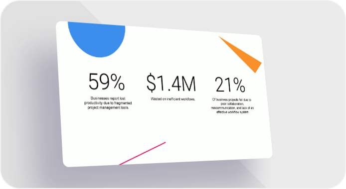 1 %XVLQHVVHVUHSRUWORVW :DVWHGRQLQHIILFLHQWZRUNIORZV 2IEXVLQHVVSURMHFWVIDLOGXHWR SURGXFWLYLW\GXHWRIUDJPHQWHG SRRUFROODERUDWLRQ SURMHFWPDQDJHPHQWWRROV PLVFRPPXQLFDWLRQDQGODFNRIDQ HIIHFWLYHZRUNIORZV\VWHP