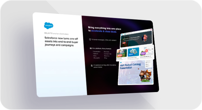Bring everything into one place to accelerate & close deals RELAYTO anchor client story Tailored messages, CTAs and content Salesforce now turns one-off assets into end-to-end buyer journeys and campaigns One platform. Many formats Presentation Microsite Flipbook Content Hub Video Web Doc Infographic Blog AI-assisted selling with interactive presentation