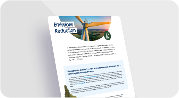 Emissions Reduction To put the planet on course for a 1.5°C future in the long-term, we need to monitor, avoid, and reduce the greenhouse gas emissions across both our operations and entire value chain, as well as spur systemic changes that will achieve emissions reductions at scale. Core to Salesforce’s climate action journey is the continued reduction of our absolute emissions in a way that achieves a just and equitable transition to net zero, in line with a 1.5°C future. We are proud to share that we have reached an important milestone in 2021 – achieving 100% renewable energy. As a cloud pioneer and sustainability leader, Salesforce has been committed to accelerating the transition to clean and renewable sources of purchasing renewable energy equivalent electricity since 2013. This means to the amount of electricity we use to power our global operations on an annual basis. Our renewable energy journey has always been about much more than adding new megawatts of renewable energy to the grid. Our goal is to ensure the energy transition meets its true potential for improving the state of the world, which includes more than megawatts thinking about , to try and maximize the economic, social, as well as human and ecosystem health benefits of clean energy. Our work won’t stop now that we have reached 100% renewable energy. The ultimate goal is something bigger and more complex, because matching our fossil fuel use alone won’t be enough. This is why, through behavior change and policy advocacy, we continue to work toward a future where clean and renewable energy is powering our operations and the world around the clock. To identify the most impactful opportunities to lower our carbon footprint, we looked across our entire business, using Net Zero Cloud. Together with our business partners, we can report more quickly on Scope 1, 2, and 3 emissions and share progress via Slack with dashboards and analytics. Net Zero Cloud allows us to track emissions reductions strategies by category -- Work From Anywhere, Infrastructure, Business Travel, and Supply Chain1 -- securing resources and setting goals across our Scope 1, 2, and 3 emissions. We will continue to iterate on these strategies through our annual planning process. Not only do we use Net Zero Cloud ourselves, but it empowers our customers with a complete, actionable view of their carbon emissions data. It enables businesses to quickly track, analyze, and report on their environmental footprint with reliable, investor-grade data. This data quality is essential for third-party audits, financial filings, corporate reputation, and building trust with all stakeholders. Going forward, we will continue to leverage Net Zero Cloud data to track our progress. 1: More information on our emissions categories can be found in the Stakeholder Impact Report. 4 | Salesforce.com/sustainability
