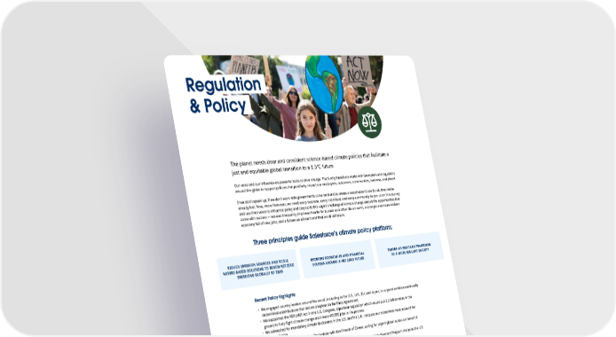 Regulation & Policy The planet needs clear and consistent science-based climate policies that facilitate a just and equitable global transition to a 1.5°C future. Our voice and our influence are powerful tools to drive change. That’s why Salesforce works with lawmakers and regulators around the globe to support policies that positively impact our employees, customers, communities, business, and planet. If we don’t speak up, if we don’t work with governments to be bold and to create a sustainable future for all, then we’ve already lost. Now, more than ever, we need every business, every individual, and every community to join us on this journey and use their voice to influence policy and step up to the urgent challenge of climate change and all the opportunities that come with success — reduced inequality, improved health for human and other life on earth, a stronger and more resilient economy full of new jobs, and a future we all want and that we all will share. Three principles guide Salesforce’s climate policy platform: Reduce emission sources and scale Reorient economies and financial Ensure an equitable transition nature-based solutions to reach Net Zero systems around a Net Zero future to a more resilient society emissions globally by 2050 Recent Policy Highlights: 2 We engaged country leaders around the world, including in the U.S., U.K., EU, and Japan, to support ambitious nationally determined contributions that deliver progress on the Paris Agreemeno 2 We supported the REPLANT Act in the U.S. Congress, bipartisan legislation which would put 1.2 billion trees in the ground to help fight climate change and create 49,000 jobs in the proces& 2 We advocated for mandatory climate disclosures in the U.S. and the U.K., because our economies must account for climate chang3 2 We signed the Ocean Super Year Declaration with the Friends of Ocean, calling for urgent global action on behalf of ocean healt„ 2 We called for the U.S. to make critical climate investments like the Clean Electricity Payment Program that puts the U.S. on a path to reach 50-52% emission reduction by 2030 We use our voice and our influence to reorient the global economy around a Net Zero future by advancing policies that internalize the cost of carbon, remove subsidies for fossil fuels, and align with science. 2 Formalized climate as a public policy priority for Salesforc3 2 Advocate for leading climate policies globally in alignment with our climate policy principle& 2 Utilize our global presence to establish recognized climate policy programs in all critical geographies where our employees live and work8 2 Bring others with us by building coalitions, mobilizing our ecosystem in new ways, building alignment within our trade associations, and empowering other organizations to join us on their own climate policy journey Resources Check out Salesforce’s climate policy principles and how we advocate for Learn more about why Salesforce chose to codify climate policy as part of clear and consistent science-based climate policies that facilitate a just the company’s public policy platform. and equitable global transition to a 1.5°C future. Racial Equality and Justice Learn more about our policy pillar in the Taskforce . 11 | Salesforce.com/sustainability
