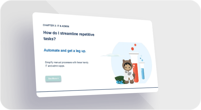 Salesforce Microsite [Template] Page 4 Page 6CHAPTER 3: IT & ADMIN How do I streamline repetitive tasks? Automate and get a leg up. Simplify manual processes with these handy IT and admin apps. See More +