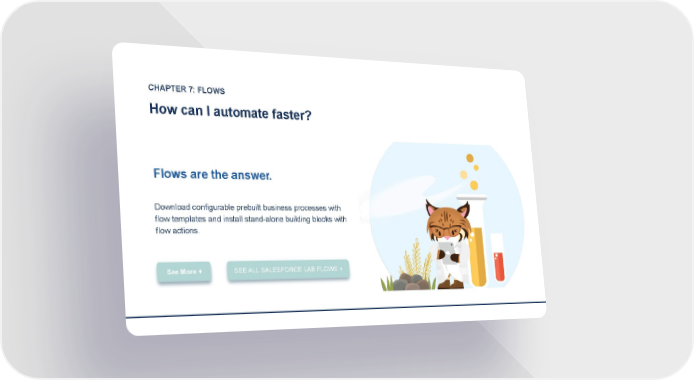 CHAPTER 7: FLOWS How can I automate faster? Flows are the answer. Download configurable prebuilt business processes with flow templates and install stand-alone building blocks with flow actions. See More + SEE ALL SALESFORCE LAB FLOWS +