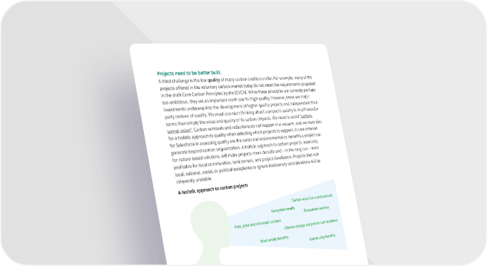 Projects need to be better built. A third challenge is the low quality of many carbon credits on offer. For example, many of the projects offered in the voluntary carbon market today do not meet the requirements proposed in the draft Core Carbon Principles by the ICVCM. While these principles are currently perhaps too ambitious, they set an important north star for high quality. However, there are major investments underway into the development of higher-quality projects and independent third- party reviews of quality. We must also start thinking about a project’s quality in much broader terms than simply the value and quality of its carbon impacts. We need to avoid “carbon tunnel vision”. Carbon removals and reductions do not happen in a vacuum, and we must aim for a holistic approach to quality when selecting which projects to support. A core criterion for Salesforce in assessing quality are the social and environmental co-benefits a project can generate beyond carbon sequestration. A holistic approach to carbon projects, especially for nature-based solutions, will make projects more durable and — in the long run — more profitable for local communities, land owners, and project developers. Projects that lack local, national, social, or political acceptance or ignore biodiversity considerations will be inherently unstable. A holistic approach to carbon projects Carbon reductions and removal Ecosystem health Ecosystems services Free, prior and informed consent Climate change adaptation and resilience Biodiversity benefits Community benefits We have learned invaluable lessons from successful projects. However, some of our most important lessons have come from our engagement with projects that don’t end up meeting our high standards for quality and co-benefits. For example, sometimes project developers are unable to credibly document how investment funds are being used and what portion is shared back with the local community. Other times, projects will use unrealistic calculations of their climate benefits (i.e., over estimating what deforestation rates might have been without their intervention). 9 | A JUST TRANSITION TO A NET ZERO, NATURE POSITIVE WORLD