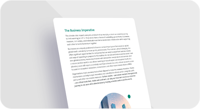 The Business Imperative The climate crisis impacts everyone, and each of us must play a role in our collective journey to limit warming to 1.5° C. If we are to have a chance of succeeding, governments, businesses, investors, civil society, and individuals must demonstrate bold climate action while supporting each other to build momentum together. Businesses are uniquely positioned to have an outsize impact given their access to capital, global reach, and ability to move quickly and innovate. This moment, while challenging, also offers significant opportunities for companies that are ready to adapt their business models and ways of operating to prepare for the realities of a net zero and nature-positive world. A net zero global economy means new markets with demand for new products and services. And a nature-positive world is one where investing in natural capital and ecosystem health at a planetary scale will require an entirely new financial asset class and a vibrant economic sector focused on ecosystem restoration, conservation, and other nature-based solutions (NBS). Organizations must use every tool at their disposal to make the necessary transition. Market mechanisms can help to spur innovation and cost-effective climate action, alongside public policy and other non-market measures. Carbon credits — and carbon markets more generally — are critical tools that, made and used well, can play an important role in our collective journey to net zero while simultaneously helping us build a nature-positive world. 3 | A JUST TRANSITION TO A NET ZERO, NATURE POSITIVE WORLD