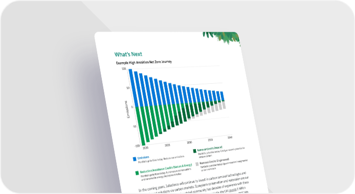 What’s Next Example High Ambition Net Zero Journey Emissions Removal Credits (Nature) Portfolio priorities today: Reduce our emissions Portfolio priorities today: Catalyze nature’s potential to remove carbon Reduction/Avoidance Credits (Nature & Energy) Removal Credits (Engineered) Portfolio priorities today: Fund nature conservations Portfolio priorities today: Spur innovation in engineered and renewable energy deployment today carbon removals In the coming years, Salesforce will continue to invest in carbon removal technologies and nature-based solutions via carbon markets. Ecosystem conservation and restoration are our top priorities for now because the global community has decades of experience with these actions. And ecosystem restoration can be scaled up massively; the UN counts 1 billion hectares of degraded land which Governments have committed to restore. The IPCC 6th Assessment report Working Group III on Mitigation lists a range of nature-based solutions that can successfully be applied, from agroforestry to regenerative agriculture, reforestation, and restoration of high-carbon ecosystems such as wetlands, mangroves, and peatlands. Science tells us we will also need engineered carbon dioxide removal technologies at massive scale by mid century. That’s why in May 2022, we committed to purchase $100 million of durable carbon credits from technologies that remove carbon from the atmosphere by 2030. The investment is a part of an initiative from the First Movers Coalition (FMC), a group announced by President Biden at COP26, which aims to harness the purchasing power of companies to decarbonize “hard to abate” industrial sectors. Advance market commitments like those from FMC members send a clear demand signal that there’s a market need which entrepreneurs will innovate to fill. 12 | A JUST TRANSITION TO A NET ZERO, NATURE POSITIVE WORLD
