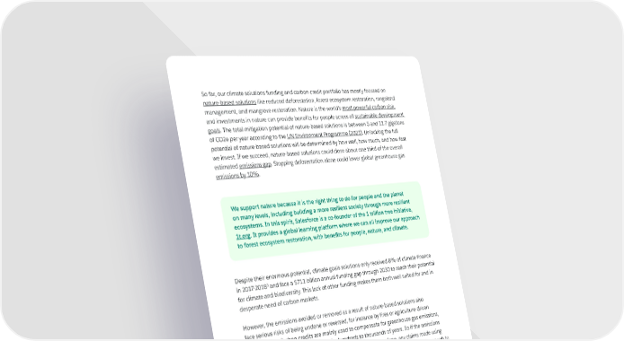 So far, our climate solutions funding and carbon credit portfolio has mostly focused on nature-based solutions like reduced deforestation, forest ecosystem restoration, rangeland management, and mangrove restoration. Nature is the world’s most powerful carbon sink, and investments in nature can provide benefits for people across all sustainable development goals. The total mitigation potential of nature-based solutions is between 5 and 11.7 gigatons of CO2e per year according to the UN Environment Programme (2021). Unlocking the full potential of nature-based solutions will be determined by how well, how much, and how fast we invest. If we succeed, nature-based solutions could close about one third of the overall estimated emissions gap. Stopping deforestation alone could lower global greenhouse gas emissions by 10%. We support nature because it is the right thing to do for people and the planet on many levels, including building a more resilient society through more resilient ecosystems. In this spirit, Salesforce is a co-founder of the 1 trillion tree initiative, 1t.org. It provides a global learning platform where we can all improve our approach to forest ecosystem restoration, with benefits for people, nature, and climate. Despite their enormous potential, climate goals solutions only received 8% of climate finance in 2017-20183 and face a $711 billion annual funding gap through 2030 to reach their potential for climate and biodiversity. This lack of other funding makes them both well suited for and in desperate need of carbon markets. However, the emissions avoided or removed as a result of nature-based solutions also face serious risks of being undone or reversed, for instance by fires or agriculture-driven deforestation. Carbon credits are mainly used to compensate for greenhouse gas emissions, which will remain in the atmosphere for hundreds to thousands of years. So if the emissions avoided or removed by a nature-based solutions project are undone, any claims made using the carbon credits from that project are no longer true. Some believe this risk is high enough to warrant stopping investments in nature via carbon markets entirely. However, forests and other ecosystems, if measured across large enough areas, are highly stable over millennia, and the science is clear: Nature in aggregate must play a major role in mitigating climate change. We believe the risk of reversal is motivation to improve the quality and durability of nature-based credits so they can reach their full potential. To that end, we’re working to develop new forms of carbon credits that further mitigate risks with partners like the LEAF coalition, which generates credits from entire countries and jurisdictions rather than more vulnerable individual projects. 3Source: https://nature4climate.org/news/a-snapshot-of-nbs-in-action-today/. 6 | A JUST TRANSITION TO A NET ZERO, NATURE POSITIVE WORLD