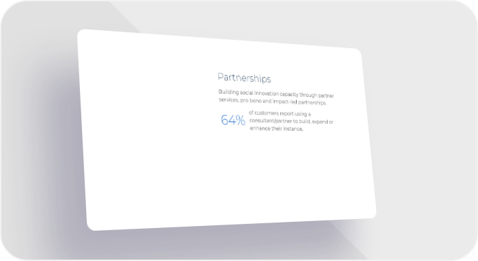 Partnerships Building social innovation capacity through partner services, pro bono and impact-led partnerships. of customers report using a consultant/partner to build, expand or 64% enhance their instance.