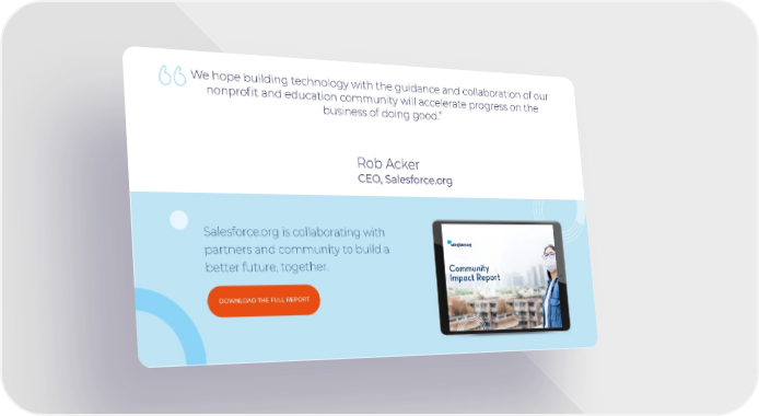 We hope building technology with the guidance and collaboration of our nonprofit and education community will accelerate progress on the business of doing good.” Rob Acker CEO, Salesforce.org Salesforce.org is collaborating with partners and community to build a better future, together. DOWNLOAD THE FULL REPORT