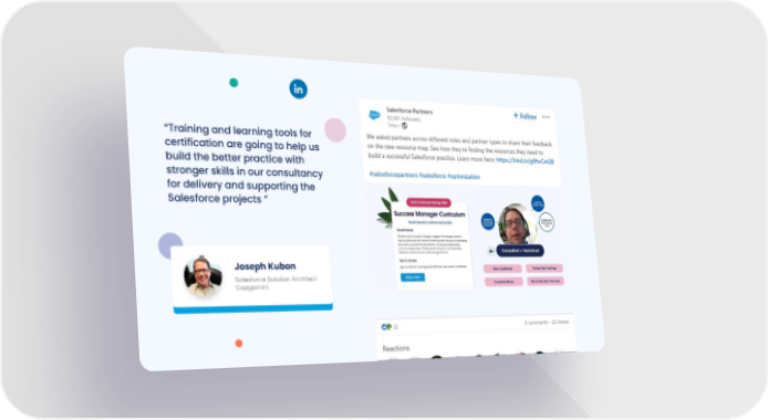 “Training and learning tools for certification are going to help us build the better practice with stronger skills in our consultancy for delivery and supporting the Salesforce projects ” Joseph Kubon Salesforce Solution Architect Capgemini