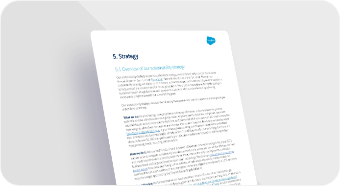 5. Strategy 5.1 Overview of our sustainability strategy Our sustainability strategy supports our business strategy, an overview of which can be found in our Annual Report in Item 1 of our Form 10-K , filed with the SEC on March 17, 2021. Through our sustainability strategy, we aspire to be a climate action leader and to tap into the full power of Salesforce to help protect the environment for future generations. We prioritize innovative sustainability strategies to deliver impact at a global scale and we seek to build trust with our stakeholders by achieving measurable progress towards our sustainability goals. Our sustainability strategy includes the following three core tenets, which support the shared global goal of Net-Zero emissions: What we do: As a technology company, the solutions we offer to our customers have the greatest potential to drive climate action on a global scale. As governments, industries, companies, nonprofits and individuals work to accelerate to Net-Zero, we believe that all of our customers will require innovative technology to allow them to measure and manage their carbon footprint. This is why we have launched Salesforce Sustainability Cloud, a greenhouse gas accounting tool to help our customers understand their emissions and take meaningful climate action. In addition, we offer our technology for free or at a discount to over 51,000 non-profits and higher education institutions focused on addressing today’s most pressing needs, including climate action. 1 How we do it: We reached Net-Zero and procured 100 percent renewable energy in fiscal year 2022, and we strive to integrate sustainability into all aspects of our business and our service offerings. We have also made investments in a healthy work environment, environmentally-friendly events, sustainable business travel and targeted investments in clean technology. We obtain an independent accountant’s review report from Ernst and Young LLP on selected climate and sustainability metrics so that our stakeholders can have confidence in our progress. We’ve also aligned our company to a 1.5°C emissions reduction target approved by the Science-Based Targets Initiative. Our influence: We believe that we can have a positive climate influence on our society through engagement with customers, employees, governments, peers, stockholders and suppliers. To this end, in fiscal 2021 we released our c limate policy principles, which outlines our climate advocacy goals and provides a framework for others to follow. In addition, our S cience-Based Target includes a commitment to help our suppliers representing approximately 60 percent of our upstream Scope 3 emissions to set their own Science-Based Targets by fiscal 2025. We open-sourced our approach to renewable energy and featured expert third-party guidance in our M ore than a Megawatt whitepaper. We also provided our technology to underpin initiatives designed to drive climate action, such as o ur tree tracker and donation platform and 1 T.org. We expect that the collective efforts to rapidly decarbonize the global economy will provide opportunities across all industries. O ur sustainability strategy and global partnerships aim to capture these opportunities and benefit the planet. 1 In practice there are varying interpretations of Net-Zero. Our Net-Zero achievement in fiscal year 2022 includes: (1) Committing publicly to the shared, global goal of achieving a just and equitable transition to Net-Zero, in line with a 1.5°C future; (2) Prioritizing reducing emissions as quickly as possible by aligning our full value chain emissions (Scope 1, 2 and 3) to the global trajectory of approximately 50 percent emissions reductions by 2030 and near-zero emissions by 2040; and (3) Compensating for any residual emissions by purchasing renewable energy and carbon credits of high credibility, impact and co-benefits using a combination of avoidance and removal credits. Over time, we plan to transition to using removal credits only to offset residual emissions. 13 | Salesforce TCFD Report