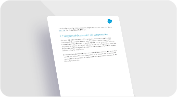 A detailed discussion of the risks and uncertainties facing our business can be found in Item 1A in our Form 10-K , filed with the SEC on March 17, 2021. 4.3 Integration of climate-related risks and opportunities Concurrent with, and in addition to the ERM program, the sustainability team regularly evaluates climate-related risks and opportunities over various time horizons. Throughout this process, the sustainability team stays informed on the latest developments in climate science and the modeling of temperature rise scenarios, including their likelihoods and their impacts. This process includes evaluating the potential impact of the physical and transition risks of climate change on the likelihood, magnitude and velocity of our key enterprise risks. On an annual basis, the sustainability team works with the ERM team to consider these climate-related risks and opportunities in the context of, and relative to, our key enterprise risks. The outcome of this process is that climate-related risks are considered both on a standalone basis and as a potential driver of other key business risks. 12 | Salesforce TCFD Report
