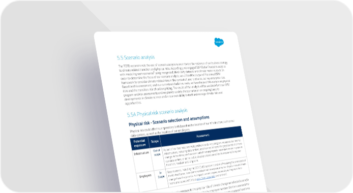 5.5 Scenario analysis The TCFD recommends the use of scenario analysis in order to test the resilience of our business strategy to climate related transition and physical risks. Accordingly, we engaged S&P Global Trucost to assist us 7 with modeling such scenarios using recognized, third-party datasets and climate model outputs. In order to determine the focus of our scenario analysis, we utilized the output of the annual ERM framework to consider climate-related risks in the context of, and relative to, our key enterprise risks. Based on this assessment, and our current residual risks levels, we have focused this analysis on physical risks and the transition risk of carbon p ricing. The results of this analysis will be used to inform our ERM program and risk assessments and we plan to update the scenarios on an ongoing basis for developments in climate science and in our own ability to track and manage climate risks and opportunities. 5.5A Physical risk scenario analysis Physical risk - Scenario selection and assumptions Physical risk could affect our operations both based on the location of our infrastructure, such as our data centers, as well as the location of our employees. Potential Scope Assessment exposure Out of As part of our business continuity and service delivery program, we assess our internal Infrastructure scope infrastructure, including data centers, and their resilience to the physical risk of climate change. At this time, we have concluded that appropriate redundancies are in place at our data centers, or at the public cloud providers we utilize, to ensure resiliency over the short, medium and long term. In Recent events, including the COVID-19 pandemic and wildfires along the west coast of Employees Scope the United States, have demonstrated that the exposure to the physical risks of climate change have the potential to impact our employees, especially as they work from home and as we shift into a w ork from anywhere environment. In order to assess our employee’s exposure to the physical risks of climate change we selected a sample of key Salesforce locations based on our largest office sites by employee number. We then assessed the 8 9 exposure of each location to physical climate risk categories under various climate scenarios and time 10 horizons . 7 These scenarios do not encompass all climate risks or opportunities faced by our company and are intended to be used as a starting point to assess specific climate related risks over various time horizons. These scenarios are subject to significant assumptions and uncertainty. 8 Climate physical risk categories assessed include: Flood, water stress, heatwave, coldwave, hurricanes, sea level rise and wildfire. 9 Climate Scenarios considered: Wherever possible, we utilized the CMIP5 climate model utilized in the IPCC’s 5th Assessment Report with the RCP8.5, RCP4.5 and RCP2.6 pathways representing high, moderate and low scenarios respectively, looking out to both 2030 and to 2050. For hazards where CMIP5 data could not sufficiently model these scenarios, such as water stress, alternative sources like the WRI Aqueduct Water Risk Atlas were utilized. These scenarios are summarized, below: High Climate Change Scenario (RCP 8.5): Continuation of business as usual with emissions at current rates. This scenario is expected to result in warming in excess of 4˚C by 2100. Moderate Climate Change Scenario (RCP 4.5): Strong mitigation actions to reduce emissions to half of current levels by 2080. This scenario is more likely than not to result in warming in excess of 2˚C by 2100. Low Climate Change Scenario (RCP 2.6): Aggressive mitigation actions to halve emissions by 2050. This scenario is likely to result in warming of less than 2˚C by 2100. 10 Time horizons considered include: One year, ten years, and thirty years. 19 | Salesforce TCFD Report