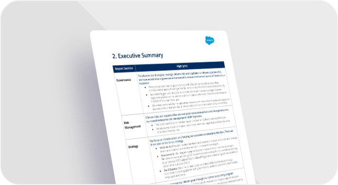 2. Executive Summary Report Section Highlights To advance our strategies, manage climate risks and capitalize on climate opportunities, Governance we have established a governance framework to ensure involvement across all levels of our business: ● Three of our seven standing committees of the B oard have specifically identified climate-related areas of oversight that fall within that committee’s areas of responsibility. ● Sustainability goals are included at the enterprise level in our annual organizational alignment process which includes our Vision, Values, Methods, Obstacles and Measures (“V2MOM”) for each fiscal year. ● We embed sustainability throughout our business with ownership of sustainability goals by key executives, employee-led initiatives and cross-functional sustainability committees. Climate risks and opportunities are evaluated on an annual basis and incorporated into Risk our overall enterprise risk management (“ERM”) process: Management ● The Sustainability team provides regular updates to the Board and the ERM team. ● We assess the impact of climate risks on the likelihood, magnitude and velocity of our other key enterprise risks. We focus on climate action and helping our customers accelerate to Net-Zero. There are Strategy three core tenets to our strategy: ● What we do: Products like the Salesforce Sustainability Cloud can help customers manage their carbon emissions and develop their climate action strategies. ● How we do it: We integrate sustainability into all aspects of our business by being a Net-Zero company, achieving 100 percent renewable energy for our operations, working to achieve our 1.5˚C-aligned Science-Based Target and collaborating with our vendors to decarbonize our supply chain. ● Our Influence: We strive to have a positive climate influence on society through multi-stakeholder engagement with governments, suppliers, customers, stockholders, employees and peers. We actively manage our climate goals through our carbon accounting program: Metrics and ● We utilize Salesforce Sustainability Cloud to measure our progress against our goals. Targets ● We have obtained an independent accountant’s review report on selected sustainability and climate metrics for the past four years. Our climate risk assessment, ongoing activities to mitigate the physical and transition risks of climate change and our scenario analyses conducted in fiscal 2022 indicate that the physical and transition risks of climate change are not material to our business. However, we expect that the impacts of climate change will be systemic and non-diversifiable and that the transition to decarbonize the global economy will provide opportunities across all industries, including the technology industry. Our sustainability strategy and global partnerships aim to capture this opportunity, mitigate risks to our company and benefit the planet. 6 | Salesforce TCFD Report