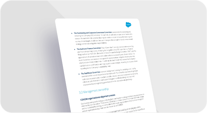 ● The Nominating and Corporate Governance Committee i s responsible for overseeing and reviewing the Company’s ESG initiatives. For example, at least once per year, senior leaders who oversee the environmental sustainability program provide a report on our performance against our key climate targets. In addition, the committee provides oversight of overall environmental strategy and reviews and guides major initiatives. ● The Audit and Finance Committee ( “Audit Committee”) o versees our corporate accounting and financial reporting process, including the integration of key ESG topics into our financial filings such as our Form 10-K, filed with the Securities and Exchange Committee (“SEC”), and the appointment of our external auditor to review selected sustainability and climate metrics. The Audit Committee also oversees management’s assessment and mitigation of enterprise risks, which include climate-related risks. In addition, the Audit Committee reviews the Company’s capital structure and financial and treasury policies and strategies, including the issuance of and reporting on the Company’s sustainability bond. ● The Real Estate Committee o versees management’s strategy for providing a safe, healthy environment for our employees to do their best work. The committee approves all significant real estate expansions and reductions and the process it oversees incorporates sustainability criteria as part of initial site search, prioritizing green-certified buildings and leasehold improvements and negotiating green lease terms for new and existing buildings. 3.2 Management ownership V2MOM organizational alignment process Our business and growth strategies, including both our long-term strategy and day-to-day operations, are informed by our core values. These values, including our consideration of the impact of climate change and our sustainability strategy, are embedded in the day-to-day operations of our business through an annual organizational alignment exercise known as our V2MOM. The V2MOM is an internal management tool used by all employees which incorporates our vision, values, methods, obstacles and measures for each fiscal year. Embedding sustainability into our V2MOM We embed sustainability into our corporate V2MOM because we know climate change can impact all aspects of our business and because all stakeholders have a role to play in climate action. By embedding sustainability at the highest levels of our corporate strategic planning, we consider the impacts of climate change and our impact on the environment when deciding: ● What we do ( our service offerings) ● How we do it ( our operations) ● Our influence (our engagement with customers, suppliers, employees, policymakers and other stakeholders) 8 | Salesforce TCFD Report