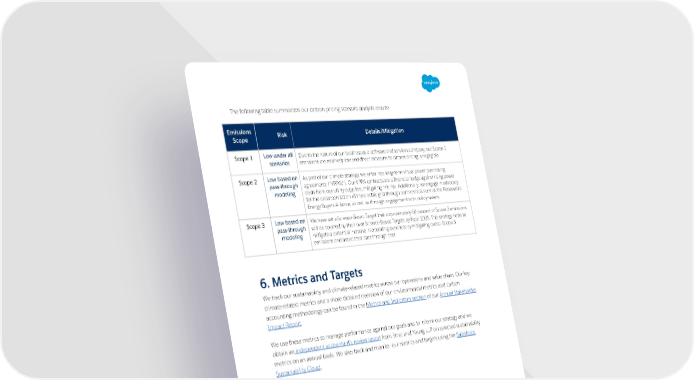 The following table summarizes our carbon pricing scenario analysis results: Emissions Risk Details/Mitigation Scope Low under all Due to the nature of our business as a software and services company, our Scope 1 Scope 1 scenarios emissions are relatively low and direct exposure to carbon pricing is negligible. Low based on As part of our climate strategy, we enter into long-term virtual power purchasing Scope 2 pass-through agreements (“VPPAs”). Our VPPA contracts are a financial hedge against rising power costs from our utility suppliers, mitigating this risk. Additionally, we engage in advocacy modeling for the decarbonization of the electric grid through partnerships such as the Renewable Energy Buyers Alliance, as well as through engagement with policymakers. Low based on We have set a Science-Based Target that approximately 60 percent of Scope 3 emissions Scope 3 pass-through will be covered by their own Science-Based Targets by fiscal 2025. This strategy helps to modeling mitigate a potential increase in operating expenses by mitigating overall Scope 3 emissions and associated pass-through cost. 6. Metrics and Targets We track our sustainability and climate-related metrics across our operations and value chain. Our key climate-related metrics and a more detailed overview of our environmental metrics and carbon accounting methodology can be found in the M etrics and Indicators section of our A nnual Stakeholder Impact Report. We use these metrics to manage performance against our goals and to inform our strategy and we obtain an independent accountant’s review report from Ernst and Young LLP on selected sustainability metrics on an annual basis. We also track and monitor our metrics and targets using the S alesforce Sustainability Cloud . 21 | Salesforce TCFD Report
