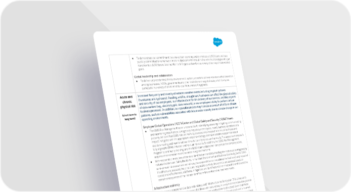 ● To demonstrate our commitment to a low-carbon economy and to embrace a 1.5˚C future, we have publicly committed to numerous climate-related commitments all in line with the shared goal of a just transition to a 1.5˚C future. See the Metrics & Targets section for a summary of our key climate-related goals. Global leadership and collaboration ● To deliver unprecedented, timely environmental action, we seek to achieve new levels of collaboration among businesses, NGOs, governments and other institutions on a global scale, which is why we participate in a variety of environmental coalitions and working groups. Increased frequency and severity of extreme weather events including tropical cyclones Acute and (hurricanes and typhoons), flooding, wildfire, drought and heatwaves can affect the physical safety chronic and security of our employees, our infrastructure for the delivery of our services, ancillary aspects physical risk of data centers (e.g., electricity grid, data network), or our employees’ ability to perform critical business processes. In addition, our operational costs may increase as a result of shifts in climate (short term to patterns, such as vulnerabilities associated with future water scarcity due to climate change in our long term) operating environments. Employee Global Operations (“GO”) Center and Global Safety and Security (“GS&S”) team ● The GS&S Risk Management team is responsible for identifying, assessing, mitigating, communicating and monitoring risks that could negatively impact our employees, brand, business operations and property. All identified GS&S risks are formally assessed and analyzed in terms of likelihood and impact, mitigated with the appropriate response strategy, communicated to support risk-based decision making and monitored over time to identify trends semi-annually. The assessment process is fully aligned to ERM’s inherent and residual risk scales. In addition, the GS&S Risk Management Program is continually evolving, and the GS&S team updates their analyses as the company scales, acquires other companies and expands our global footprint. ● With respect to climate, two of the risks identified on the GS&S Risk Register that could be triggered by natural disasters are: Safety Incidents in the Work Environment and Business Continuity. In the GS&S semi-annual risk assessment workshops, the scope of the risk is updated, the likelihood and impact of the drivers are assessed, the drivers are mapped to controls, the controls are assessed based on operational effectiveness, additional mitigations are identified and then mapped to controls and the overall consequences of the risk are identified in the context of our business model. Infrastructure resiliency ● We have a comprehensive data-redundancy and infrastructure-resiliency plan. This allows us to manage customer information and data flows with redundancy in a way that minimizes disruption to operations and the customer experience even when a data center is disrupted. Given that these arrangements already require near-live duplication of all data, no additional direct cost is incurred during data center disruptions. In addition, our IT infrastructure is decentralized, reducing our direct financial risks. A severe weather event would therefore need to impact multiple data centers at once to potentially lead to a material financial impact. 18 | Salesforce TCFD Report
