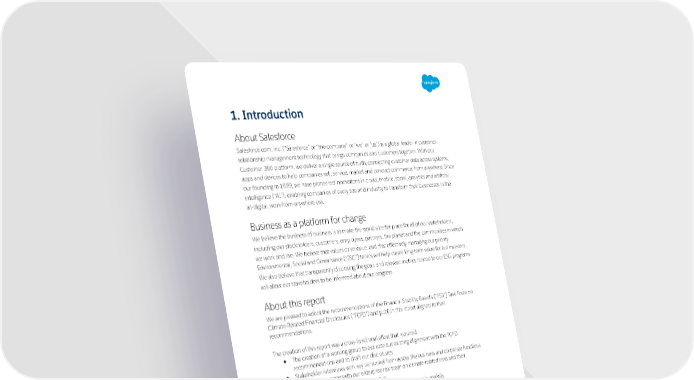 1. Introduction About Salesforce Salesforce.com, inc. (“Salesforce” or “the company” or “we” or “us”) is a global leader in customer relationship management technology that brings companies and customers together. With our Customer 360 platform, we deliver a single source of truth, connecting customer data across systems, apps and devices to help companies sell, service, market and conduct commerce, from anywhere. Since our founding in 1999, we have pioneered innovations in cloud, mobile, social, analytics and artificial intelligence (“AI”), enabling companies of every size and industry to transform their businesses in the all-digital, work-from-anywhere era. Business as a platform for change We believe the business of business is to make the world a better place for all of our stakeholders, including our stockholders, customers, employees, partners, the planet and the communities in which we work and live. We believe that values drive value, and that effectively managing our priority Environmental, Social and Governance (“ESG”) topics will help create long-term value for our investors. We also believe that transparently disclosing the goals and relevant metrics related to our ESG programs will allow our stakeholders to be informed about our progress. About this report We are pleased to adopt the recommendations of the Financial Stability Board’s (“FSB”) Task Force on Climate-Related Financial Disclosures (“TCFD”) and publish this report aligned to their recommendations. The creation of this report was a cross-functional effort that required: ● The creation of a working group to evaluate our existing alignment with the TCFD recommendations and to draft our disclosures ● Stakeholder interviews with key personnel from across the business and corporate functions ● Detailed discussions with our enterprise risk team on climate-related risks and their interconnectivity with our enterprise risks ● The engagement of a third-party to assist us with our scenario analysis This report is intended to supplement our existing stockholder engagement program and be a key part of our efforts to transparently disclose the climate-related risks and opportunities facing our business. We expect to update this disclosure as our understanding of the impacts of climate change on our planet, communities, business and the economy evolves and also as our own internal actions and governance practices evolve. This report is structured into four sections: Governance, Risk Management, Strategy and Metrics & Targets. These sections align to the TCFD’s recommended disclosures, and provide a comprehensive view into how we understand and manage the risks and opportunities associated with climate change at Salesforce. 4 | Salesforce TCFD Report