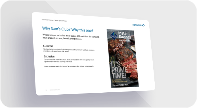Our Brand Promise | What Special Means Why Sam’s Club? Why this one? 26 Curated We hand - select our best - of - the - best products for premium quality at awesome members - only warehouse club prices. Exclusive Our private label Member’s Mark items to ensure the very best quality, flavor, ingredients/materials, sourcing and value. Some exclusives are in the form of an exclusive color, style or extras/bundle. What’s unique, exclusive, more - better - different than the standard - issue product, service, benefit or experience. BRAND GUIDELINES