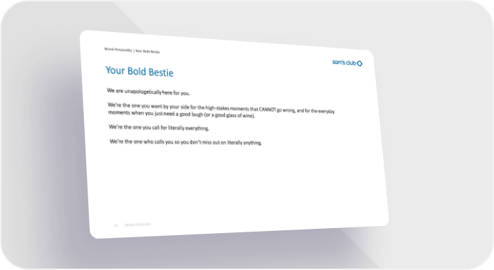 Brand Personality | Your Bold Bestie 34 We are unapologetically here for you. We’re the one you want by your side for the high - stakes moments that CANNOT go wrong, and for the everyday moments when you just need a good laugh (or a good glass of wine). We’re the one you call for literally everything. We’re the one who calls you so you don’t miss out on literally anything. Your Bold Bestie BRAND GUIDELINES