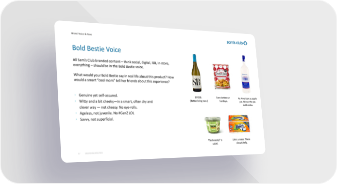 Brand Voice & Tone 37 • Genuine yet self - assured . • Witty and a bit cheeky — in a smart, often dry and clever way — not cheesy. No eye - rolls. • Ageless, not juvenile. No # GenZ LOL • Savvy, not superficial. All Sam’s Club branded content – think social, digital, ISB, in - store, everything – should be in the Bold Bestie voice. What would your Bold Bestie say in real life about this product? How would a smart “cool mom" tell her friends about this experience? BYOSB. (Better bring two.) Even better on Sundays. As American as apple pie. Minus the pie. Add vodka. *Technically* a salad. Life’s a mess. These should help. Bold Bestie Voice BRAND GUIDELINES