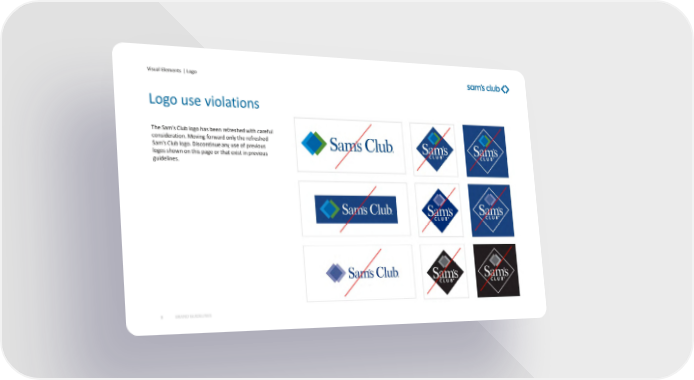 Visual Elements | Logo Logo use violations BRAND GUIDELINES 8 The Sam’s Club logo has been refreshed with careful consideration. Moving forward only the refreshed Sam’s Club logo. Discontinue any use of previous logos shown on this page or that exist in previous guidelines.