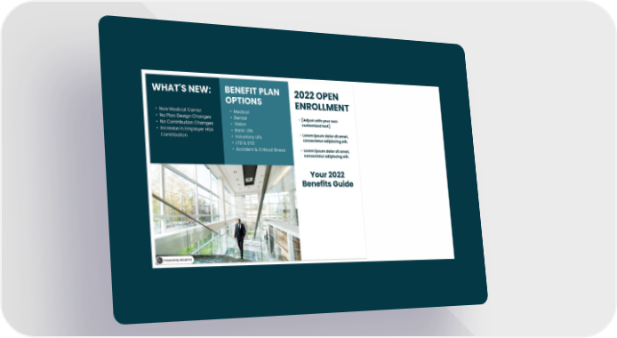 Create a memorable postcard highlighting your company's employee benefits. Perfect for new hires or during open enrollment.