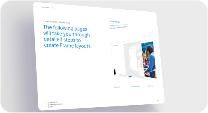 Frame layouts—step by step The following pages will take you through detailed steps to create Frame layouts. Samsung Frame layouts are composed of three layers: Message, Discovery, and Possibility. Frame layouts Message layer Discovery layer (Frame) Possibility layer 131 Frames | Design Elements