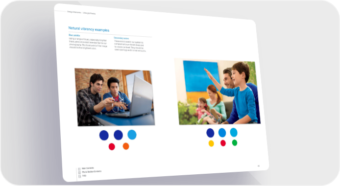 65 Lifestyle Photos | Design Elements Blue palette Using a range of blues, especially brighter blues, gives an overall branded feel to our photography. The focal point of the image should be the brightest color. Secondary colors These colors exist in our system to complement our vibrant blues and to create contrast. They should be used sparingly and in small amounts. Natural vibrancy examples