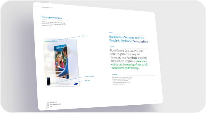 45 Type | Design Elements Typography examples This is an example of how to use Samsung InterFace with the appropriate type size and leading in a layout. Headline Product name lockup Body copy Headline Body copy Headlines are Samsung InterFace Regular in Sky Blue or Samsung Blue Body Copy is Cool Grey 9 C set in Samsung InterFace Regular. Samsung InterFace Bold and Italic are used for emphasis. Secondary colors can be used sparingly to add friendliness and vibrancy. Arial Regular and Arial Bold should be used for desktop applications in a non-graphic artwork environment such as live text in websites, Microsoft Word ® and PowerPoint ® documents. Digital usage