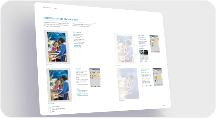 Step 5: Reformat Open your selected lifestyle photograph in Photoshop. Increase Canvas to the same dimensions as the Illustrator Art Board, centering the image. Save your new Possibility PSD. Step 6: Blur Create a new layer group called Discovery. Duplicate the Possibility Layer into the Discovery Group. Apply a 42-pixel Gaussian blur to the Possibility copy. Rename layer as Blurred. Note: 42-pixel Gaussian blur is based on 300 DPI. 300 DPI = 42-pixel blur 150 DPI = 21-pixel blur Assembling layouts: Discovery layer The depth of field and white overlay will help the viewer focus on the Possibility revealed through the Discovery layer. These steps will walk you through the creation of the Discovery layer. Step 7: Overlay Create a new layer. Fill layer with White. Adjust White Fill layer opacity between 75%–85% depending on the darkness of the image. Step 8: Extend image and save file Create a new layer. Using the clone stamp, extend the image to fill out the canvas. The image does not to be exact, but it should have a sense of belonging to the same photo. Save the Discovery PSD. Photoshop file Photoshop file Photoshop file Photoshop file original image 75% opacity 85% opacity 137 Frames | Design Elements
