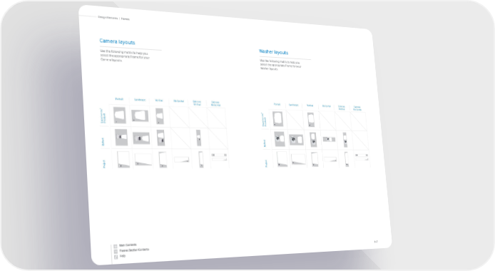 Camera layouts Use the following matrix to help you select the appropriate Frame for your Camera layouts. Washer layouts Use the following matrix to help you select the appropriate Frame for your Washer layouts. Portrait Vertical Hor iz ontal Extreme Vertical Extreme Horizontal Experience/ Product Reflect Pro ject Landscape Portrait Vertical Hor iz ontal Extreme Vertical Extreme Horizontal Landscape Experience/ Product Reflect Pro ject 147 Frames | Design Elements