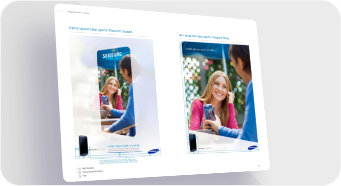 Frame layout clear space: Product Frames Frame layout clear space: Simple Frame Product name and copy can move to right to accommodate image if required. In some cases the product name may need to stack. See page 48 for more details. Respect the clear space between image and product name when adjusting layouts. 141 Frames | Design Elements