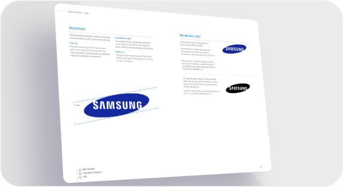 Logos Design Elements 19 | Only use the black version of the wordmark when color printing is not an option. In these cases, use the black Samsung wordmark on a white background. If white is not possible, use a grey background with no more than a 20% black tint. Samsung’s primary wordmark color is Samsung Blue (Pantone 286). The wordmark is always uppercase and encapsulated in the Samsung ellipse. It should be used as the wordmark of choice. The wordmark should be placed on a white background as often as possible. If white is not possible, use a grey background with no more than a 20% black tint. 10° Angle The Samsung wordmark is used on almost all communications, both internal and external. The Grid The well-ordered grid of our wordmark— with its strongly horizontal and vertical lines—represents the engineering discipline that drives product development. Acceleration angle The angled ellipse represents acceleration, or our speed of innovation and ongoing drive to deliver new technology to the world. Break out The lettermark breaking out of the ellipse further expresses the brand’s commitment to push innovation. Wordmark Wordmark color