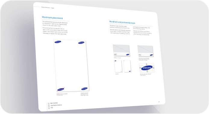 Logos Design Elements 23 | DO NOT put the wordmark on bottom left. Preferred wordmark placement is in the bottom right corner. ABC Exception The preferred Samsung wordmark placement is in the bottom right corner of layouts (with respect to the clear space rules). The wordmark can be placed in the top right or left corners when there isn’t enough space in the bottom right corner, but it is still necessary to respect the clear space rules. Wordmark placement The partner’s logo should be visually equivalent to Samsung’s wordmark in size. Both the partner’s and Samsung’s identifiers can be larger, or smaller, than that of each other depending on marketing conditions, contributions to the partnership, or the type of marketing material. However, the minimum size of 20mm should be observed to ensure consistency within Samsung’s corporate identity. Wordmark and partnership logos ABC ABC Equivalent size logos A descriptive phrase indicating the alliance may be added, it must use Samsung InterFace Regular. ABC Clear space rules must be followed in every instance.