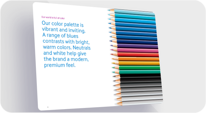 33 32 Our world is full of color Our color palette is vibrant and inviting. A range of blues contrasts with bright, warm colors. Neutrals and white help give the brand a modern, premium feel.