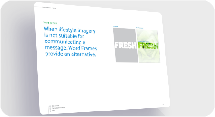 Word Frames When lifestyle imagery is not suitable for communicating a message, Word Frames provide an alternative. Word Frame Word Frame layout MoistFresh Zone keeps vegetables 125 Frames | Design Elements