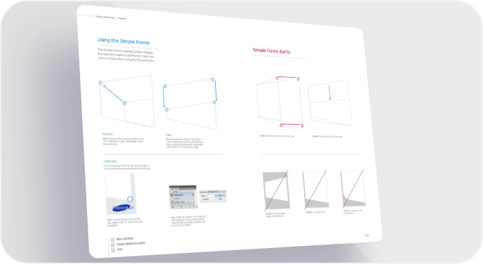 Proportion Always preserve the overall proportions and 10º acceleration angle of the Simple Frame when resizing. Shape When changing the shape of the Simple Frame, select corner points and only move them vertically. Moving points horizontally will break the 10° acceleration angle. Simple Frame don’ts DO NOT scale the Simple Frame horizontally. DO NOT show the entire Simple Frame artwork. DO NOT use sharp corners. DO NOT make the corners overly round. DO NOT scale the Simple Frame vertically. Using the Simple Frame The Simple Frame is dynamic. Even though it moves and scales to any format, there are rules to follow when using the Simple Frame. Corner radius The corner radius of the Simple Frame relates to the size of the Samsung wordmark in your layout. Step 2: With the Simple Frame selected, open Illustrator’s Appearance palette and enter the cap height value into the Round Corners effect. Step 1: In your layout, measure the cap height of the “N” in the Samsung wordmark. 119 Frames | Design Elements