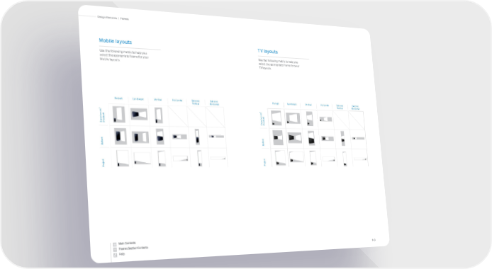 Portrait Vertical Hor iz ontal Extreme Vertical Extreme Horizontal Landscape Experience/ Product Reflect Pro ject Mobile layouts Use the following matrix to help you select the appropriate Frame for your Mobile layouts. TV layouts Use the following matrix to help you select the appropriate Frame for your TV layouts. Portrait Landscape Vertical Hor iz ontal Extreme Vertical Extreme Horizontal Experience/ Product Reflect Pro ject 143 Frames | Design Elements
