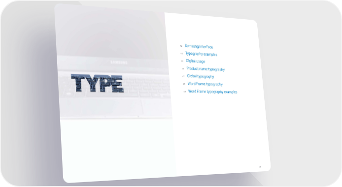 Samsung Brand Book Page 18 Page 2039 42 Samsung InterFace 44 Typography examples 44 Digital usage 46 Product name typography 47 Global typography 48 Word Frame typography 49 Word Frame typography examples