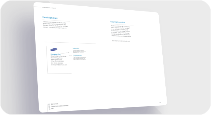 Samsung Kim Global Marketing Operations Brand Strategy Group Samsung Electronics Office +82-31-000-0000 Cell +82-31-000-0000 [email protected] The Samsung signature should be used at the end of all email communications. The Samsung wordmark sits above the name and company information; all copy is flush left. Email signature Company information: 16pt Arial Regular is used for the email signature name and the color is Grey RGB 117/120/123. Employee Name: 16pt Arial Regular is used for the email signature name and the color is Blue RGB 6/137/216. This document is intended for Samsung internal purposes only. The information contained herein is proprietary and confidential. Any use, copying, retention or disclosure by any person other than the intended recipient or the intended recipient’s designees is strictly prohibited. © 2013 Samsung Electronics Co., Ltd. Legal information Communications 163 | Internal