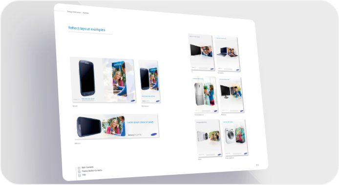 Samsung Brand Book Page 55 Page 57Spread Billboard Web banner Reflect layout examples TV Home Appliance Computing Monitors Photo Home Appliance FPO FPO 113 Frames | Design Elements