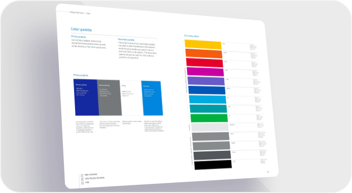 35 Color | Design Elements Primary palette Primary palette Our primary palette reflects the actual Samsung brand colors as well as the feeling of the Samsung brand. Secondary palette The bright colors of our secondary palette are used to add friendliness to the system, while the grey shades are used to lend a premium feel to the system. The secondary palette should be used for informational graphics and symbols. Color palette Samsung Blue is used for the wordmark, lettermark, and as an option for headlines, subheads and to highlight important points within body copy. White is used to create a clean, open feeling. Sky Blue is used for headlines, subheads and points within body copy. It brings the Samsung system together by appearing in layout copy as well as all lifestyle photography. Samsung Blue PMS 286 C CMYK 100/80/0/0 RGB 20/40/160 HEX 1428A0 Sky Blue PMS GOE 84-1-5 C CMYK 100/31/0/0 RGB 6/137/216 HEX 0689D8 White CMYK 0/0/0/0 RGB 255/255/255 HEX FFFFFF Samsung Grey Cool Grey 9 C CMYK 0/0/0/50 RGB 117/120/123 HEX 75787B Cool Grey 9 C is the most-used color in communications for most body copy and some headlines. Information graphics, copy emphasis Product names, subheads and body copy Graphics Secondary palette Sun Flame Berry Plum Lotus Marine Jay Kelp Ivy PMS 7548 C CMYK 0/12/98/0 RGB 255/198/0 HEX FFC600 PMS 1505 C CMYK 0/73/96/0 RGB 244/92/16 HEX FF6900 PMS 185 C CMYK 0/93/79/0 RGB 228/0/43 HEX E4002B PMS 2395 C CMYK 26/90/0/0 RGB 200/0/161 HEX C800A1 PMS 2725 C CMYK 76/76/0/0 RGB 104/91/199 HEX 685BC7 PMS 2935 C CMYK 100/52/0/0 RGB 0/87/184 HEX 0057B8 PMS 2995 C CMYK 83/1/0/0 RGB 0/169/224 HEX 00A9E0 PMS 320 C CMYK 96/0/31/2 RGB 0/156/166 HEX 009CA6 PMS 354 C CMYK 81/0/92/0 RGB 0/177/64 HEX 00B140 Platinum Silver Pebble CMYK 0/0/0/10 RGB 230/231/232 HEX E7E7E8 PMS Pantone Silver C CMYK 0/0/0/43 RGB 136/139/141 HEX 888B8D PMS Cool Grey 8 C CMYK 23/16/13/46 RGB 166/169/170 HEX A6A9AA Cloud Coal PMS Cool Grey 11 C CMYK 0/0/0/70 RGB 83/86/90 HEX 53565A CMYK 0/0/0/100 RGB 0/0/0 HEX 000000