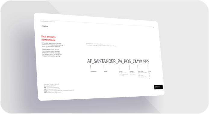 Basic Guidelines for Santander 10 1. Logot ype Final artworks nomenclature For a proper application of the logo in any format or support, it is essential to use the appropriate digital file. For that reason a final artwork nomenclature system has been developed in order to rationalize the versions and its use. It will also help you to choose the right file. The final artwork nomenclature shows: Final artwork + Santander + Version + Condition + Color mode + Format AF_SANTANDER_PV_POS_CMYK.EPS RESOURCE AVAILABLE FINAL ARTS OF THE LOGOTYPE, IN ALL COLOR MODES Final Artwork Brand Colour Mode: CMYK = Four color PMS = Pantone RGB = Screen BW = Black and white Condition: POS = Positive NEG = Negative Format: .AI .EPS .JPG .PNG .PDF The digital formats match with: AI. Adobe Illustrator CS6. EPS. Encapsulated PostScript. JPG. Compressed image in RGB. PNG. Compressed image in RGB with transparent background. P D F. Portable Document Format. Version: PV = Preferred version SV = Secondary version SY = Symbol