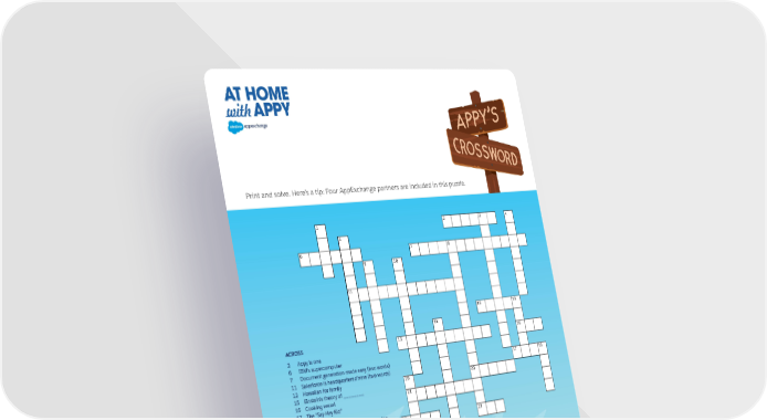 Print and solve. Here’s a tip: Four AppExchange partners are included in this puzzle. 1 2 3 4 5 6 7 8 9 10 1 1 12 13 14 15 16 17 18 19 20 21 the AppExchange magazine 22 23 18 Stuff we all get AT HOME WITH APPY 3