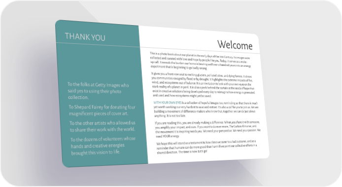 THANK YOU Welcome This is a photo book about our planet in the early days of the 21st Century. Its images were collected and curated with love and hope by people like you. Today, it serves as a wake- up call. It reveals the burden our home is bearing well over a hundred years into an energy experiment that is beginning to go badly wrong. It gives you a front-row seat to melting glaciers, polluted cities, and dying forests. It shows you communities ravaged by flood or by drought. It highlights the extreme impacts of fire, To the folks at Getty Images who wind, and ecosystems out of balance. It is an invitation to look with your own eyes on the stark reality of a planet in peril. It is also a peek behind the curtain at the seeds of hope that said yes to using their photo exist in creative solutions being developed every day to reimagine how energy is generated collection. and used and how ecosystems might yet be saved. WITH YOUR OWN EYES is a collection of hopeful images too, reminding us that there is much To Shepard Fairey for donating four yet worth working our very hardest to save and restore. It’s also a call for you to join us. We are magnificent pieces of cover art. building a movement of difference-makers who know that, together, we can do just about anything. It is not too late. To the other artists who allowed us If you are reading this, you are already making a difference. When you share it with someone, to share their work with the world. you amplify your impact, and ours. If you want to do even more, The Carbon Almanac, and the movement it is inspiring needs you. We need your perspective. We need your passion. We To the dozens of volunteers whose need YOUR energy. hands and creative energies We hope this will stand as a testament to how close we came to a bad outcome, and as a brought this vision to life. reminder that humans can do more good than harm if we point our collective efforts in a shared direction. The time is now. Let’s go!