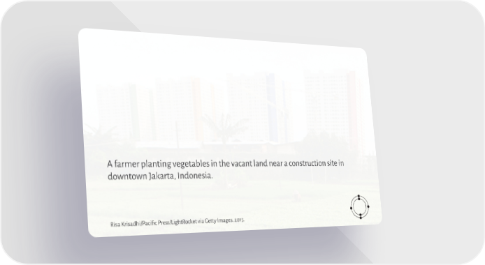 A farmer planting vegetables in the vacant land near a construction site in downtown Jakarta, Indonesia. Risa Krisadhi/Pacific Press/LightRocket via Getty Images. 2015.